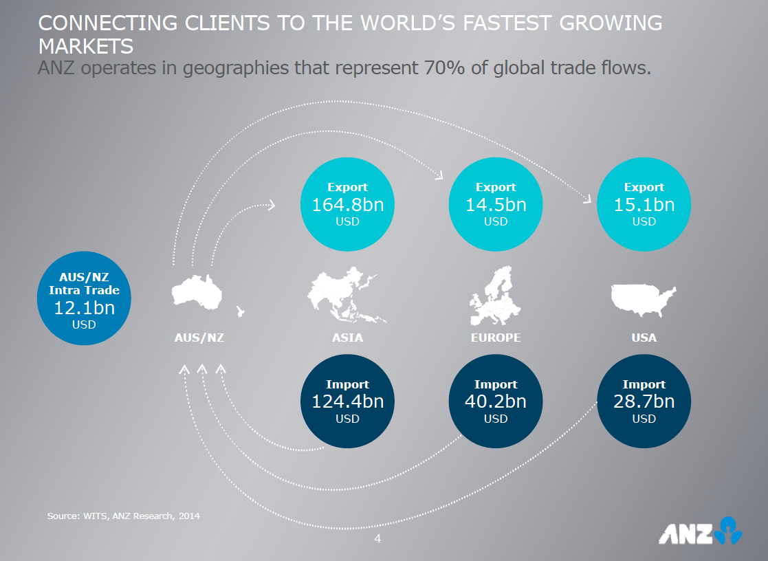And what ANZ is good at is following the trade flows to and from Australia and New Zealand to Asia as well as intra-Asia. Strong at home, ANZ has institutional banking businesses in 34 markets globally; the core of these operations is concentrated in 15 Asian markets, including China.