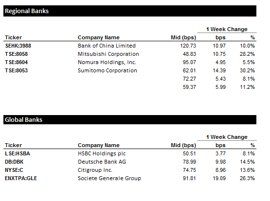 The latest five-year CS spreads of global and regional banks, provided by S&P Capital IQ.