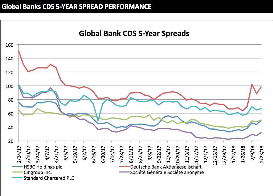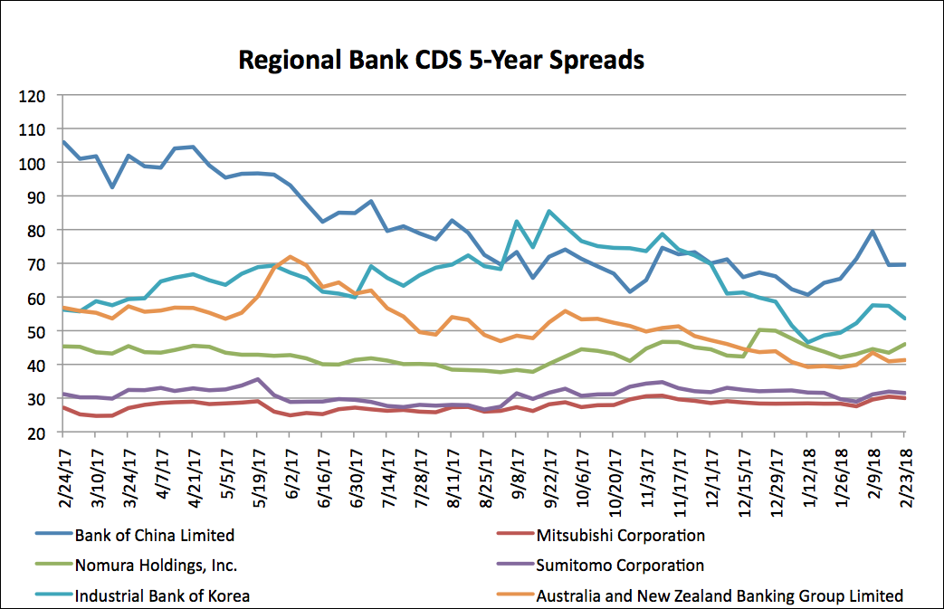 The latest five-year CDS spreads of global and regional banks, provided by S&P Global Market Intelligence.