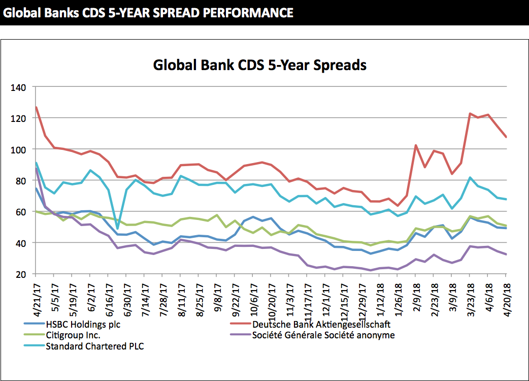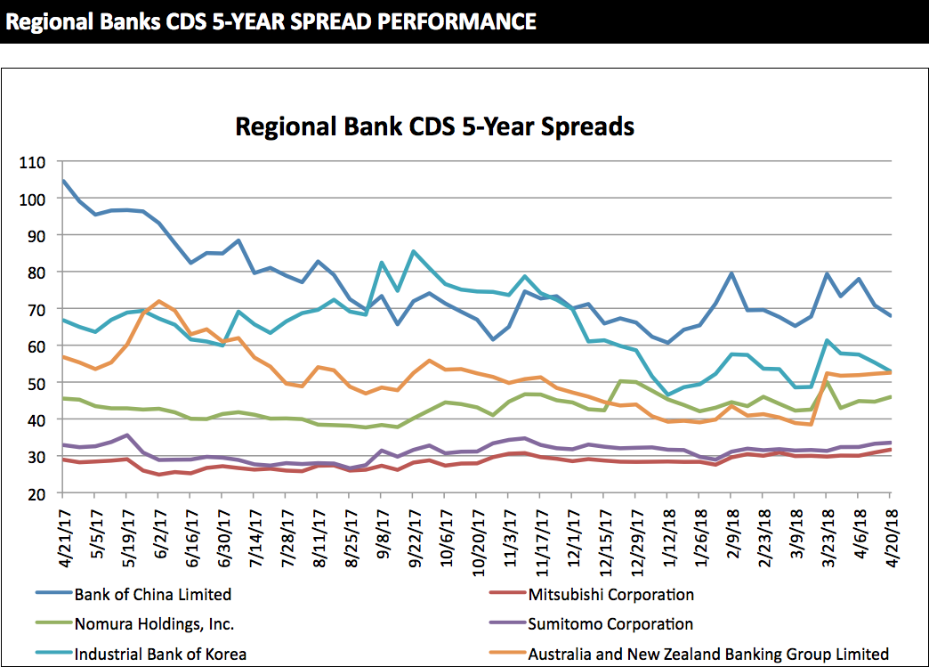 The latest five-year CDS spreads of global and regional banks, provided by S&P Global Market Intelligence.