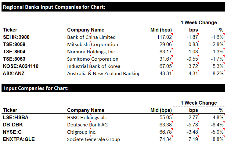 The latest five-year CDS spreads of global and regional banks, provided by S&P Capital IQ.