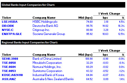 In partnership with S&P Capital IQ, CT provides a regular snapshot of the most recent movements in bank credit default swap spreads (CDS).