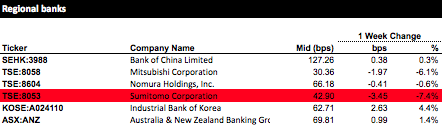 The latest five-year CDS spreads of global and regional banks, provided by S&P Global Market Intelligence.