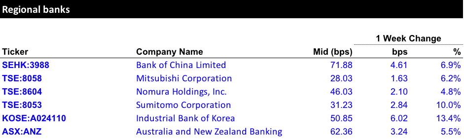 The latest five-year CDS spreads of global and regional banks, provided by S&P Global Market Intelligence.