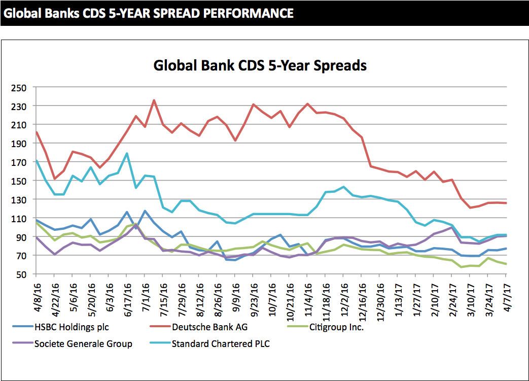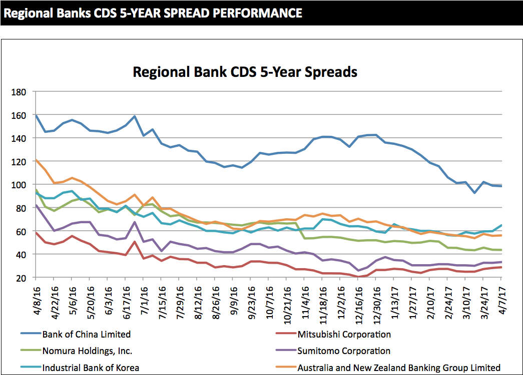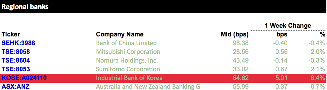 The latest five-year CDS spreads of global and regional banks, provided by S&P Global Market Intelligence.