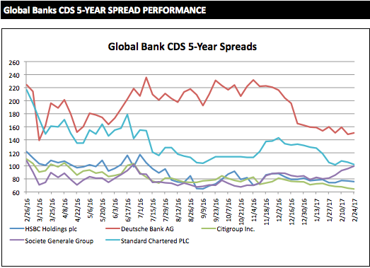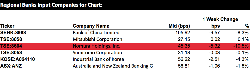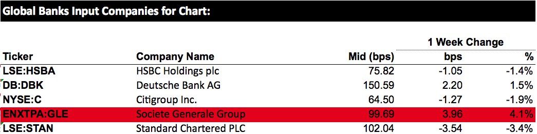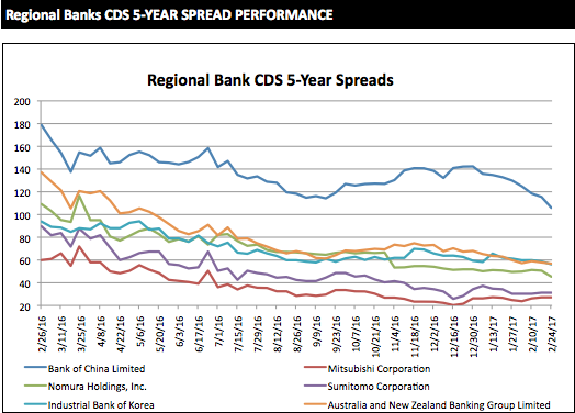The latest five-year CDS spreads of global and regional banks, provided by S&P Global Market Intelligence.