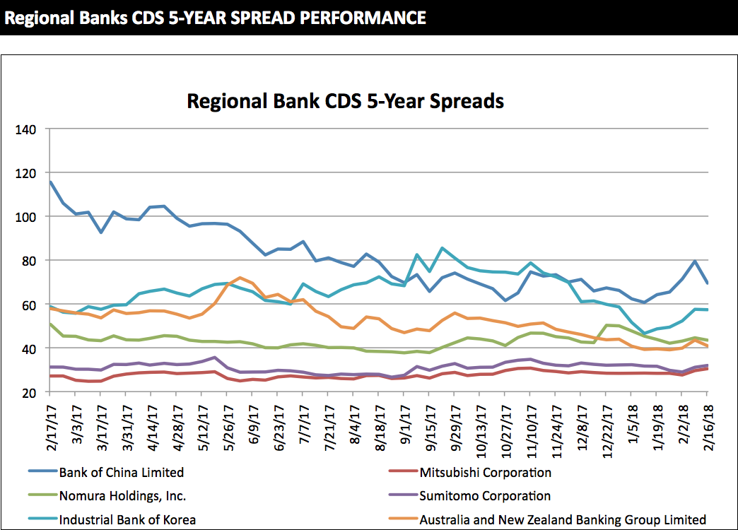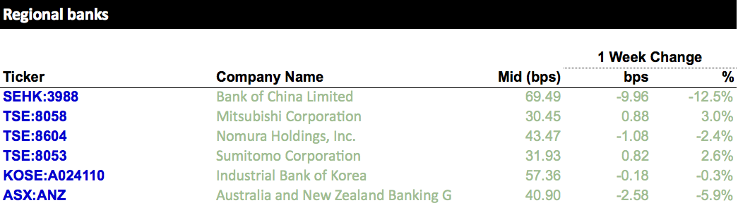 The latest five-year CDS spreads of global and regional banks, provided by S&P Global Market Intelligence.