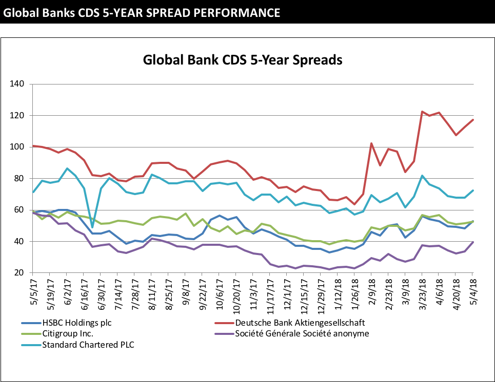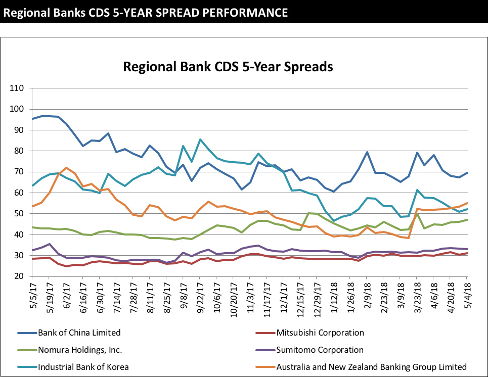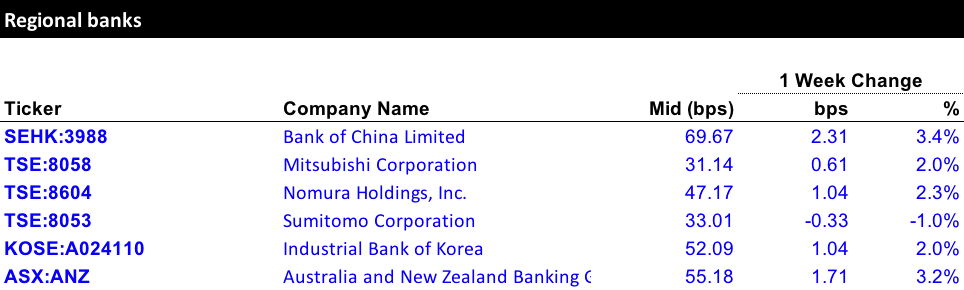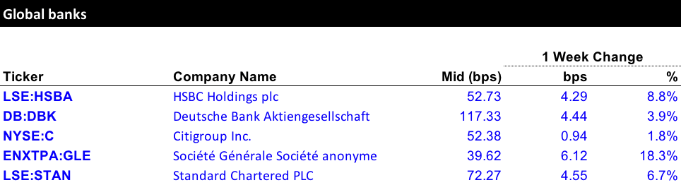 The latest five-year CDS spreads of global and regional banks, provided by S&P Global Market Intelligence.