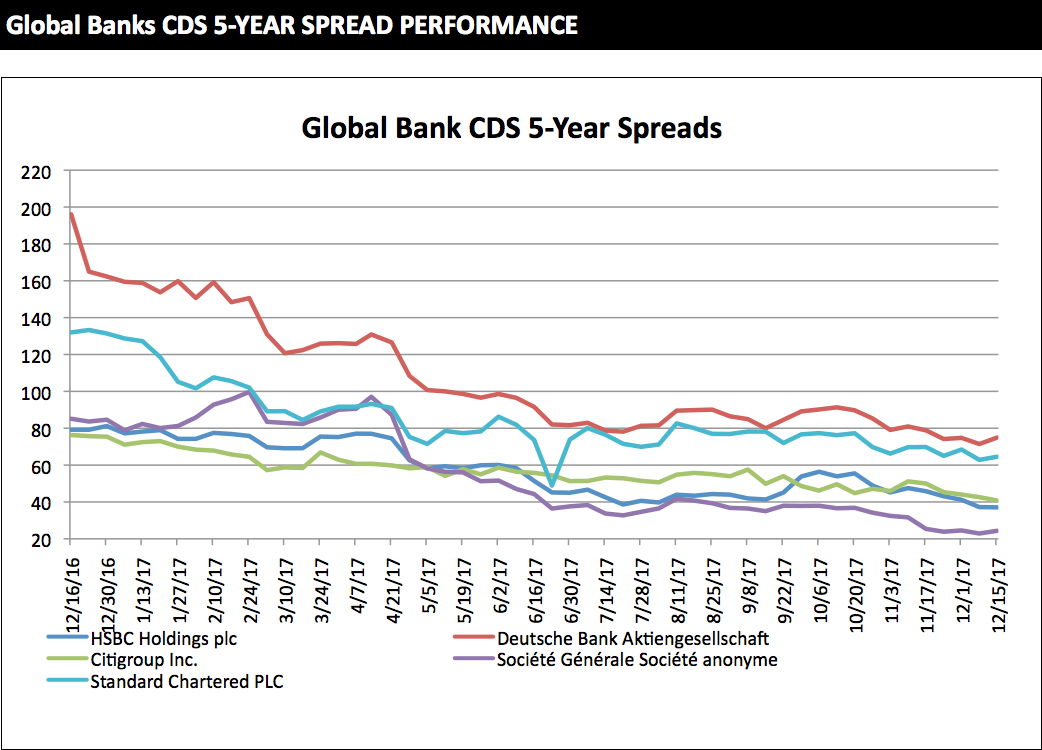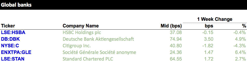 The latest five-year CDS spreads of global and regional banks, provided by S&P Global Market Intelligence.