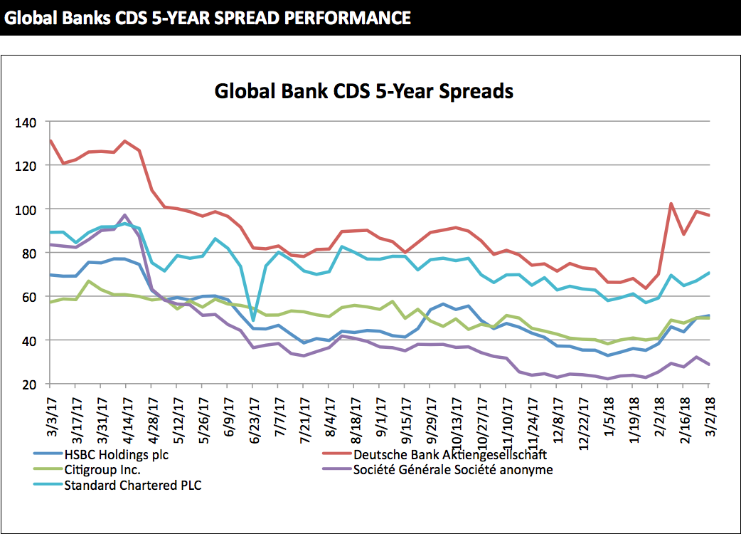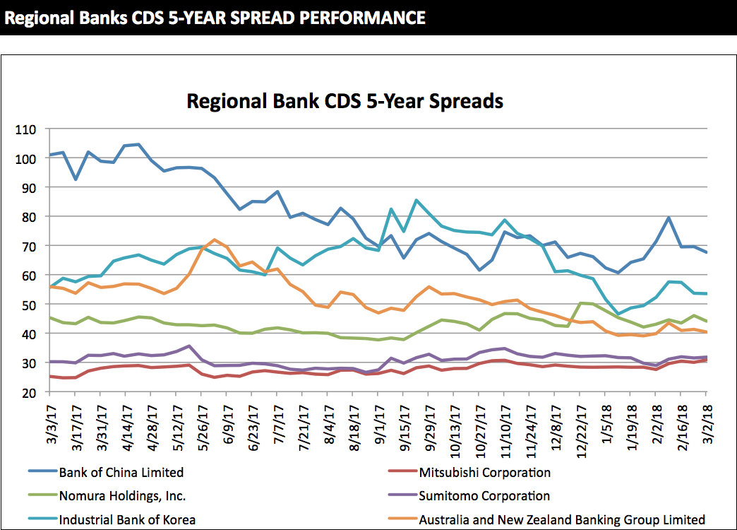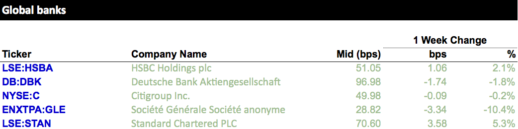 The latest five-year CDS spreads of global and regional banks, provided by S&P Global Market Intelligence.