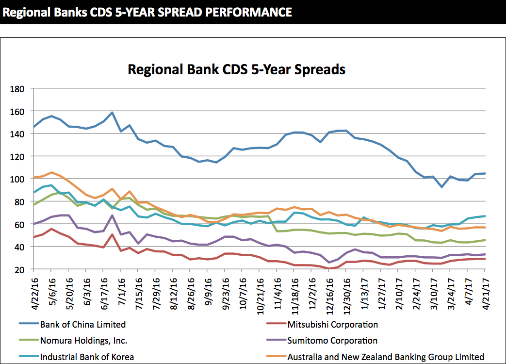 The latest five-year CDS spreads of global and regional banks, provided by S&P Global Market Intelligence.