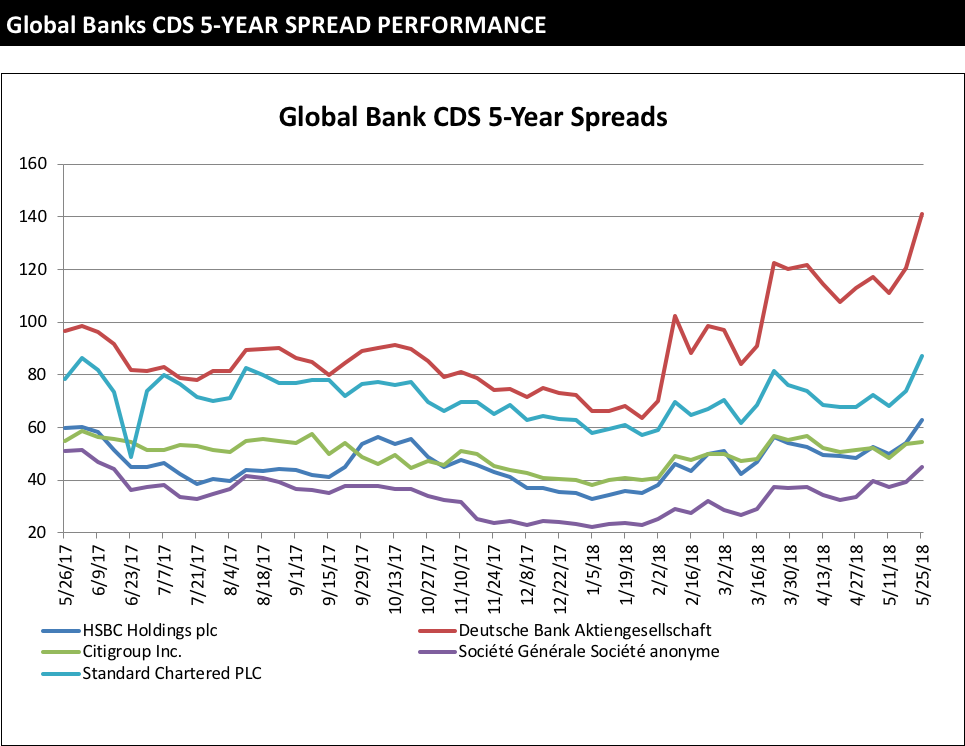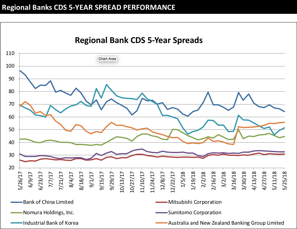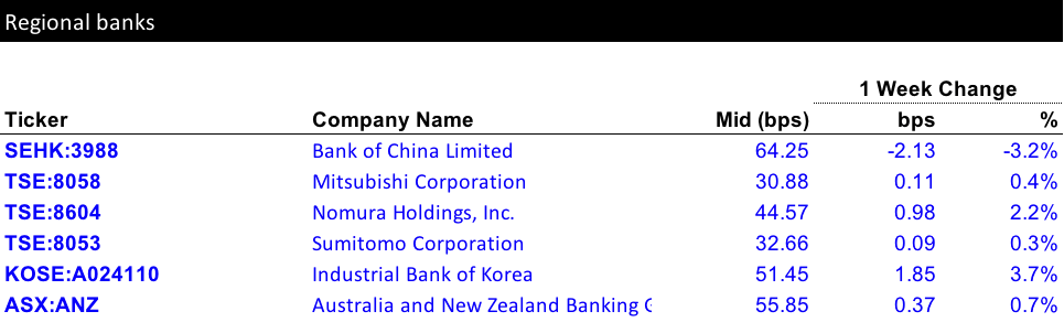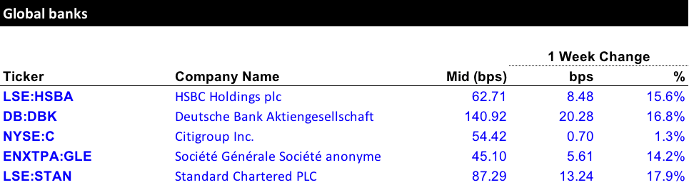 The latest five-year CDS spreads of global and regional banks, provided by S&P Global Market Intelligence.
