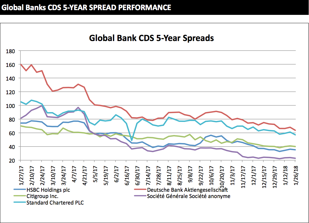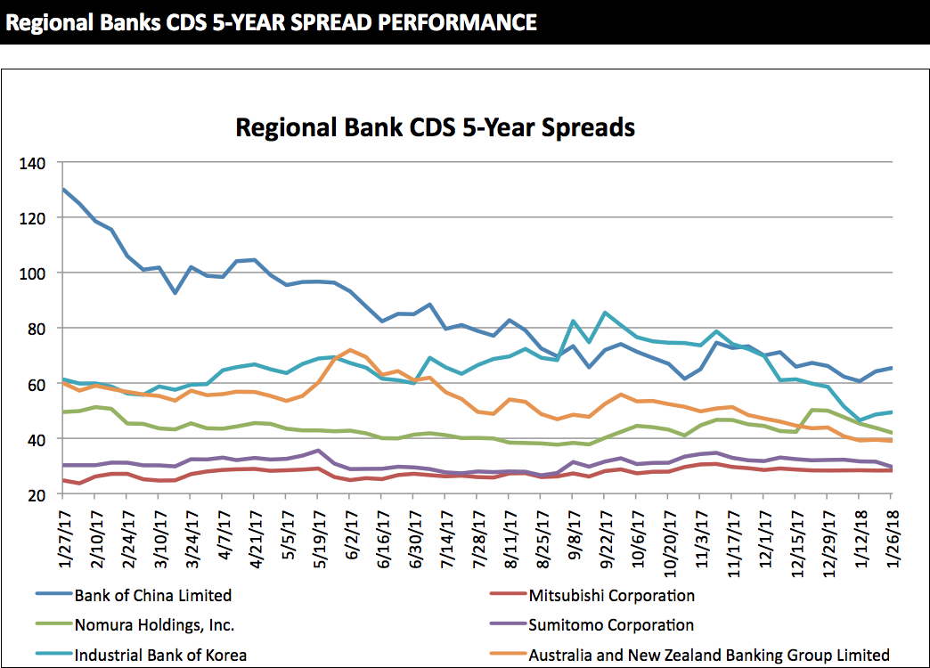 The latest five-year CDS spreads of global and regional banks, provided by S&P Global Market Intelligence.