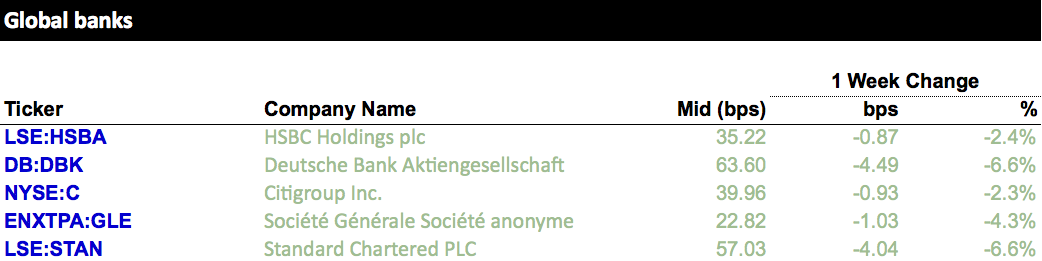 In partnership with S&P Global Market Intelligence, CT provides a regular snapshot of the most recent movements in bank credit default swap spreads (CDS).