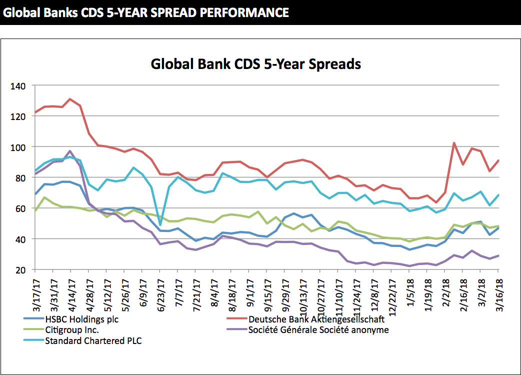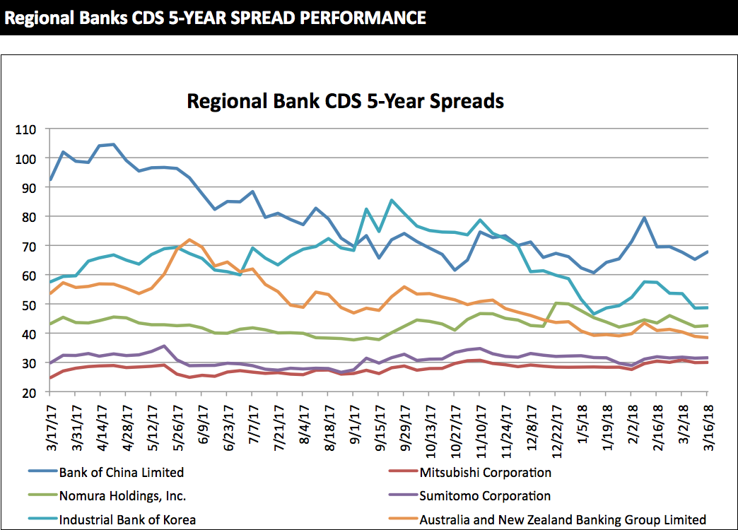 The latest five-year CDS spreads of global and regional banks, provided by S&P Global Market Intelligence.