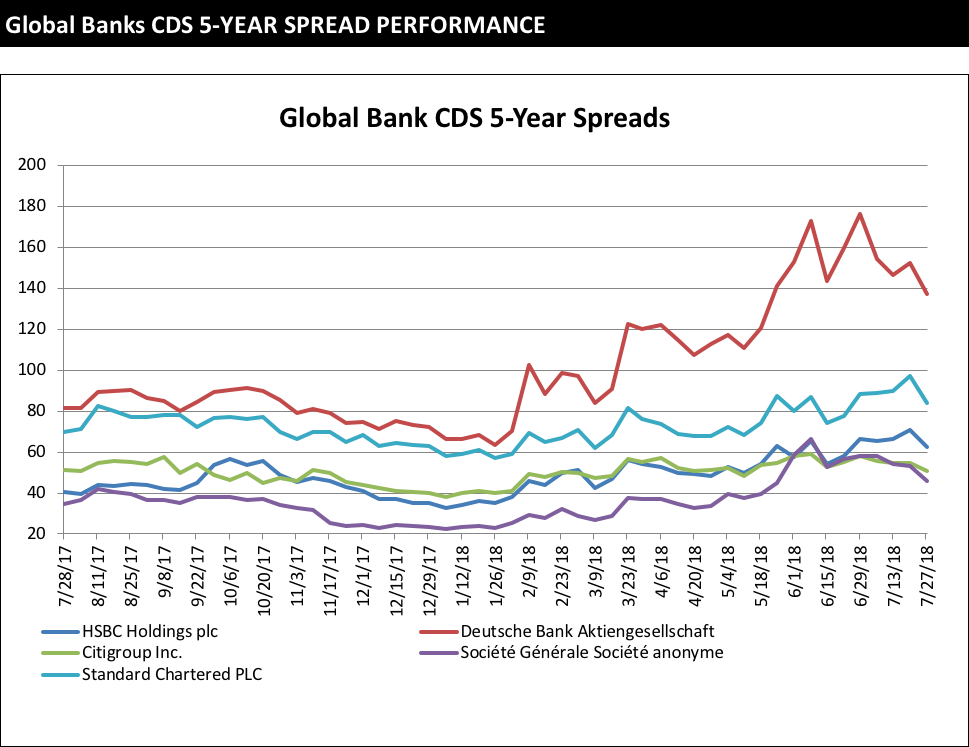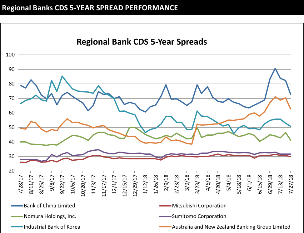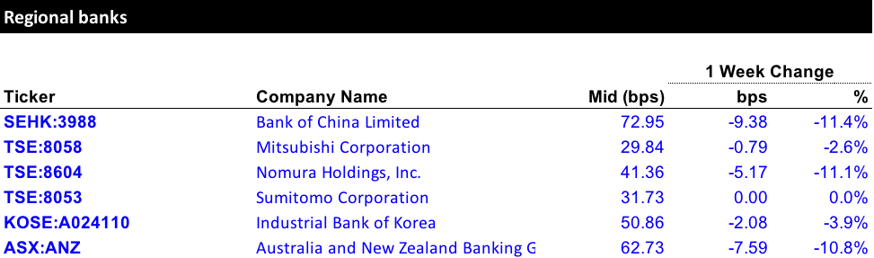 The latest five-year CDS spreads of global and regional banks, provided by S&P Global Market Intelligence.