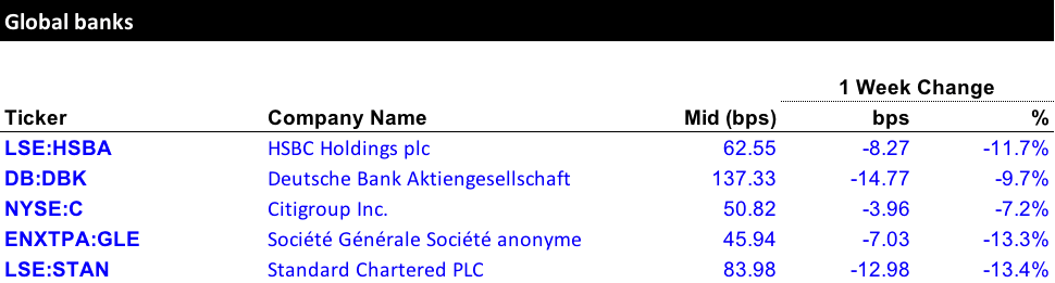 In partnership with S&P Global Market Intelligence, CT provides a regular snapshot of the most recent movements in bank credit default swap spreads (CDS).