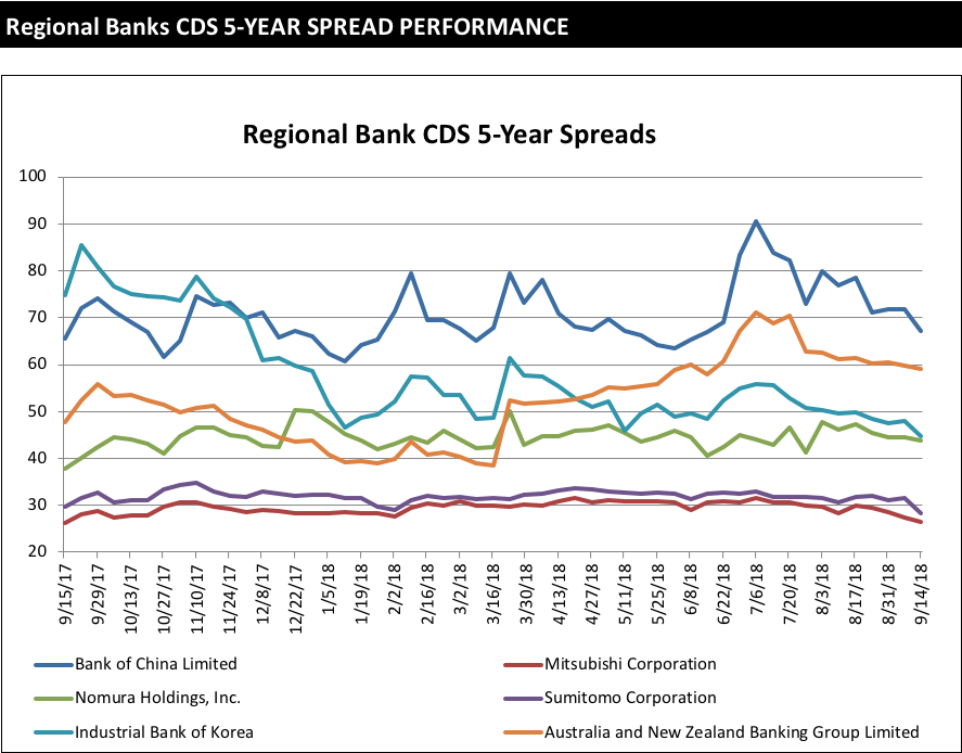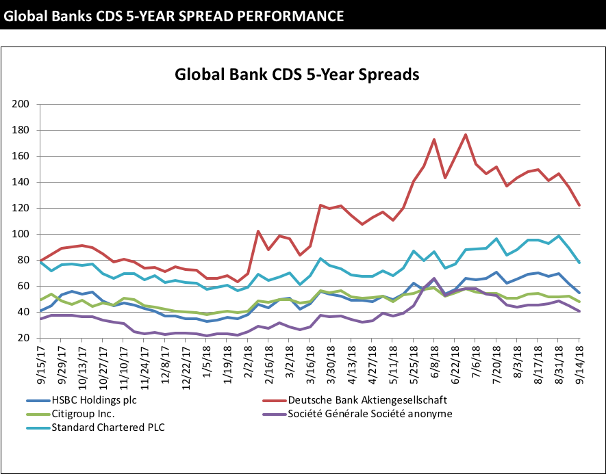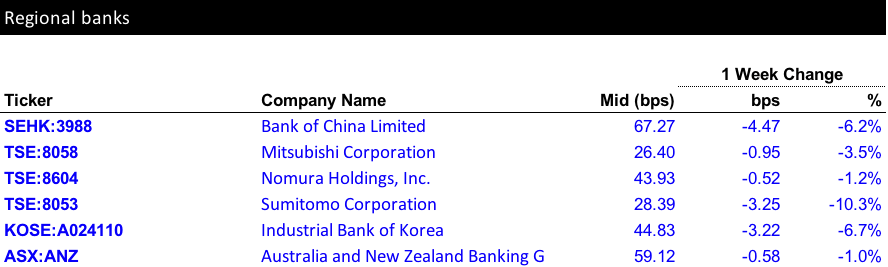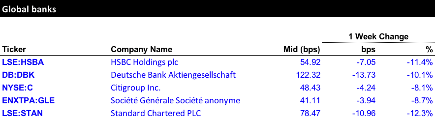In partnership with S&P Global Market Intelligence, CT provides a regular snapshot of the most recent movements in bank credit default swap spreads (CDS).