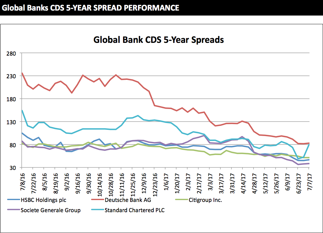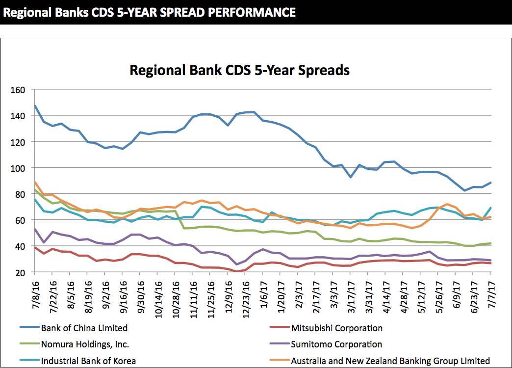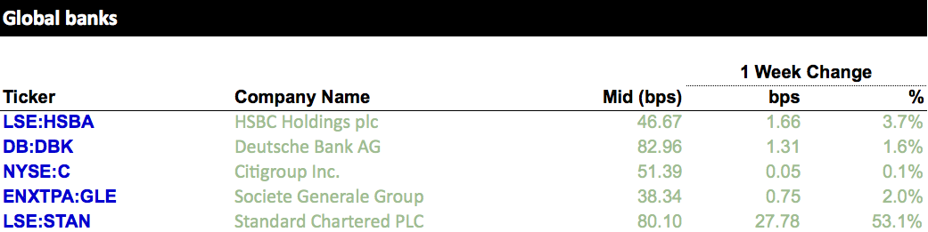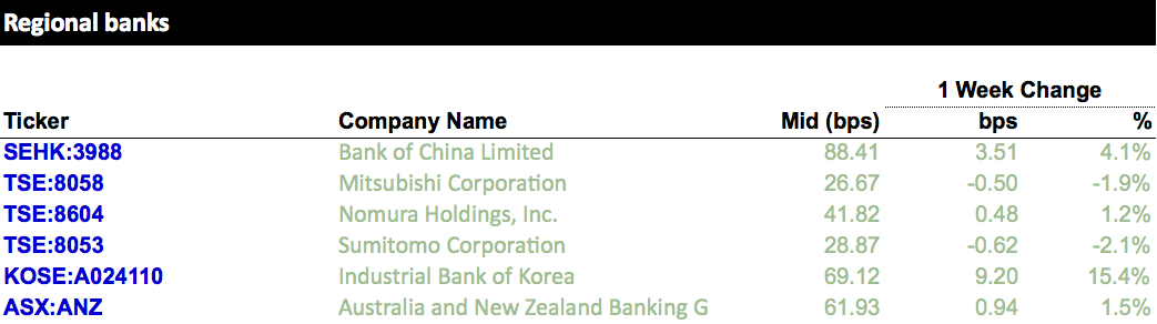 The latest five-year CDS spreads of global and regional banks, provided by S&P Global Market Intelligence.