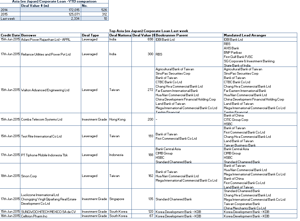 The latest corporate Asian loan volumes and deal rankings in the region, provided by Dealogic as of Tuesday, June 24. The data is used as a guide of credit appetite amongst the region's lenders.