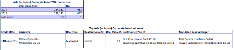 Only one deal was logged last week, according to Dealogic data. Mildex raised $53m with two mandated lead arrangers: First Commercial Bank and Taiwan Cooperative Financial Holding Company.