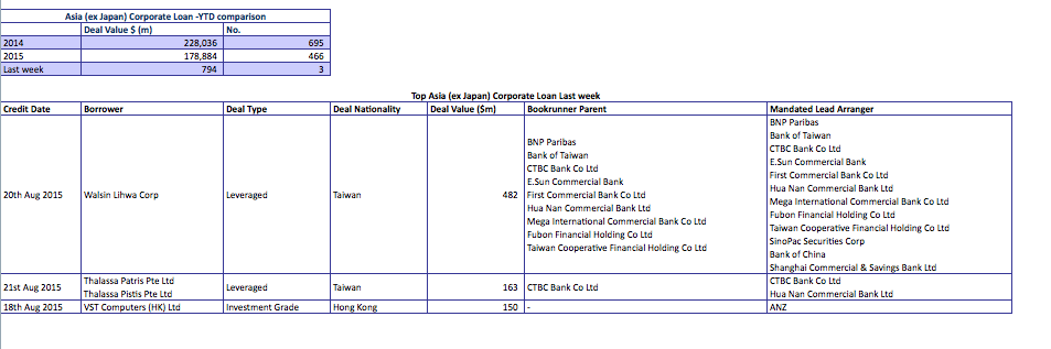 The latest corporate Asian loan volumes and deal rankings in the region, provided by Dealogic as of Tuesday, August 25. The data is used as a guide of credit appetite amongst the region's lenders.